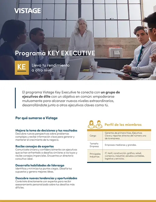 Te esfuerzas por alcanzar la excelencia mientras vives en un panorama corporativo complicado. El programa Vistage Key Executive te conecta con un grupo de ejecutivos de élite con un objetivo en común: empoderarse mutuamente para alcanzar nuevos niveles extraordinarios.